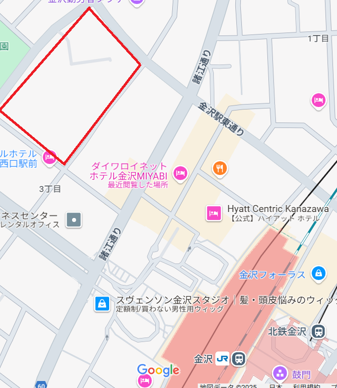 Zepp金沢の場所は、石川県「金沢駅」の西側で、現在(2025.5月時点)では、コインパーキングになっている場所の一部に建設予定です。